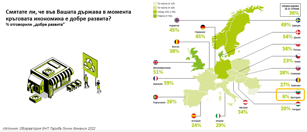 Това показва изданието за 2022 година на „Обсерватория“ – голямото годишно проучване на една от водещите финансови групи в сектора на потребителското кредитиране в Европа – BNP Paribas Personal Finance. Изследването разглежда потребителските нагласи в страните от ЕС от 1985 година и се утвърди като важен индикатор за ключови участници в потребителския сектор и автомобилната индустрия. През 2022 година, темата му е „Кръговата икономика: Възходът на потребителя предприемач“. То беше проведено в 17 държави: Австрия, Белгия, България, Чехия, Дания, Франция, Германия, Унгария, Италия, Норвегия, Полша, Португалия, Румъния, Словакия, Испания, Швеция и Великобритания като бяха интервюирани 15 800 европейци. България участва в проучването от 2017 година.