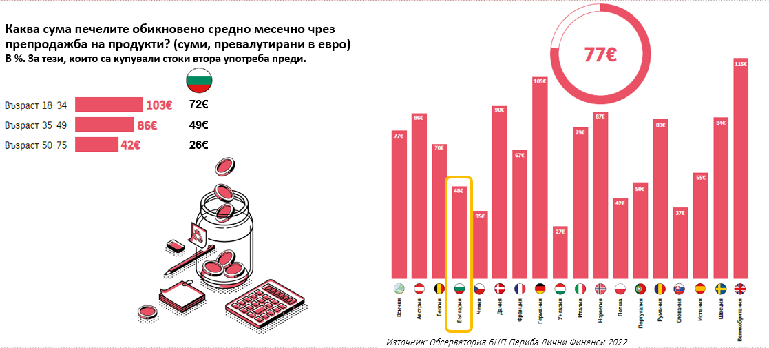 Европейците са печелили средно по 77 евро на месец от продажбата на продукти, които не използват. Най-много са спечелили британците – 115 евро, а най-малко унгарците с 27 евро. В България средният приход е по-нисък от средното за Европа – 48 евро месечно. Интересно е, че младите хора на 18-36 години у нас са реализирали по-високи печалби от продажба на продукти „втора ръка“ – 62,3 евро.