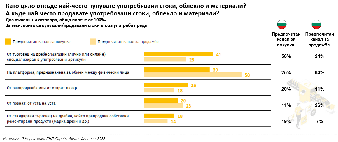 Основният канал за продажба на употребявани стоки са потребителските платформи (consumer2consumer или C2C платформите) – 58% от участниците в проучването заявяват, че са използвали тези канали. Други 25% казват, че са продали предмети, които не използват през специализирани магазини. Според данните, търговците ще играят все по-голяма роля на пазара. Почти 60% от европейците очакват, че кръговата икономика ще се движи от продукти, продавани от ритейлърите. За България делът е по-висок от средния – 72%. Това очакване се обяснява със сигурността, която търговците предоставят на хората. Тя се изразява в гаранции на продуктите, сигурна доставка и възможността за връщане, ако стоката не отговаря на очакванията.